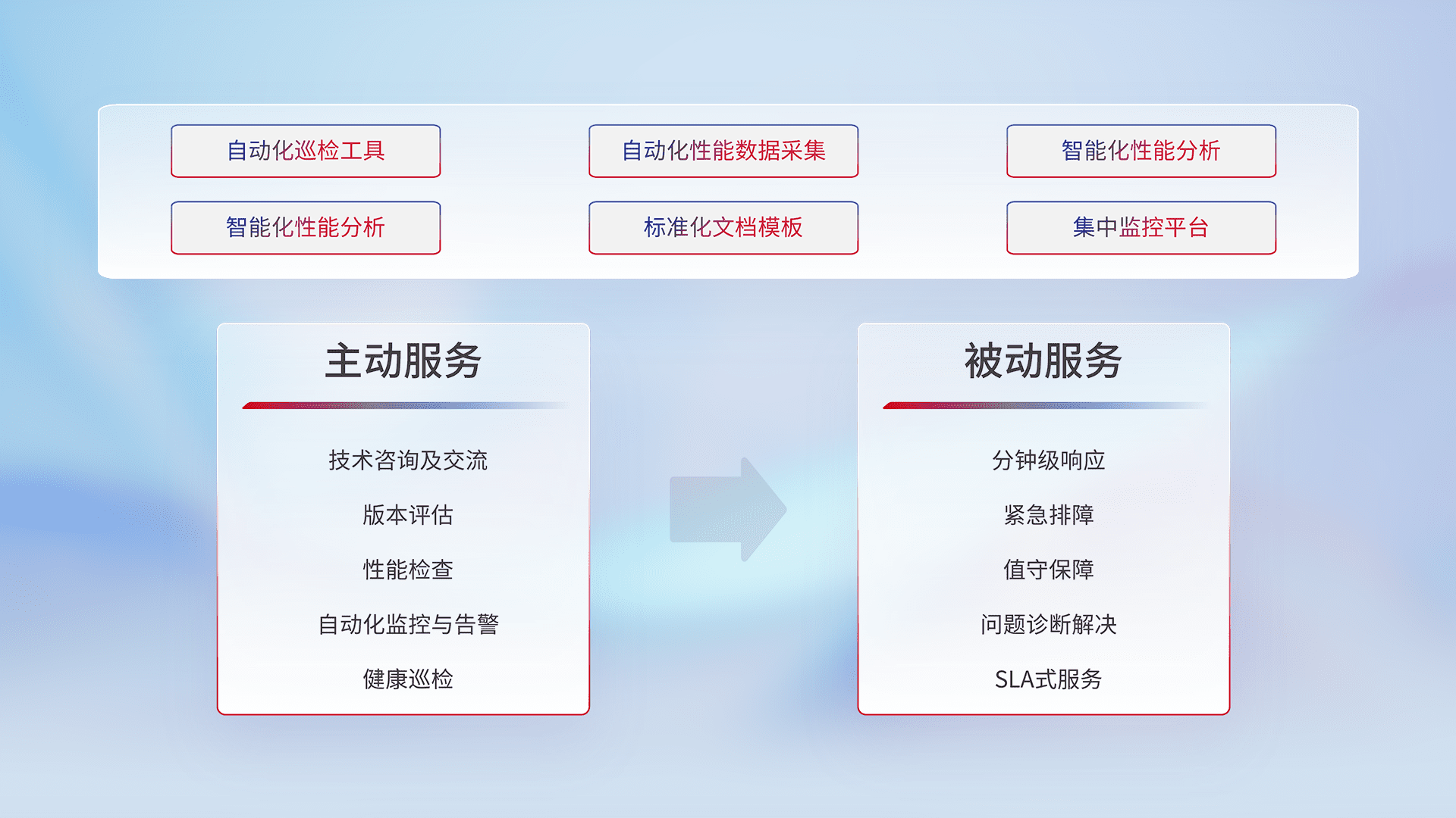 智能化工具和标准化文档,,保障服务质量,,,,提供主动服务(包含技术咨询、、、、版本评估、、、、性能检查、、、自动化监控与告警、、健康巡检)和被动服务包含(分钟级响应、、紧急排障、、、、值守保障、、问题诊断解决、、SLA服务)。。